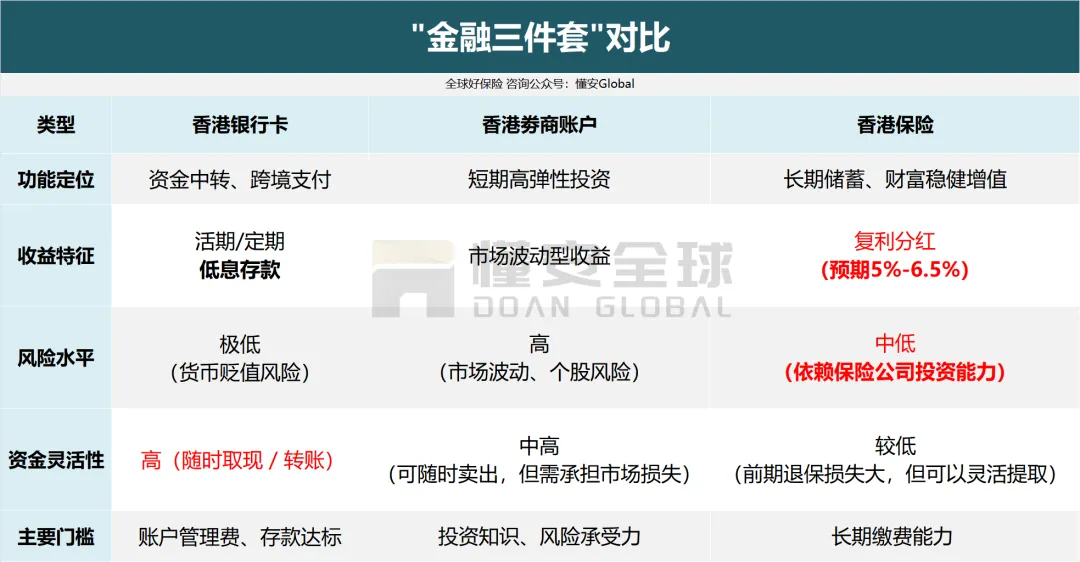 此时香港银行卡、券商账户、储蓄分红险 “金融三件套” 成热门选项,三者层层递进:银行卡是资金出海 “通行证”,券商账户是全球投资 “操盘手”,储蓄分红险则是穿越周期的 “财富压舱石”。