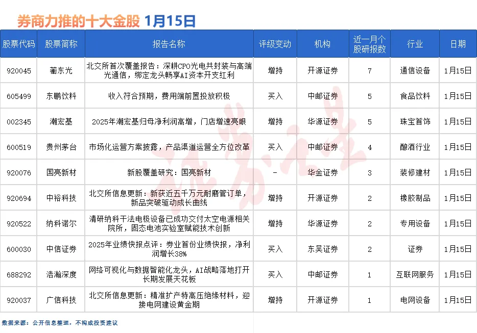 据证券之星数据库不完全统计,1月15日券商共给予超10家A股上市公司“买入”评级。从行业分布看,券商1月15日关注的个股聚焦于通信设备、食品饮料、珠宝首饰、酿酒、装修建材、橡胶制品、专用设备、证券、互联网服务、电网设备等行业。