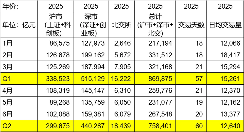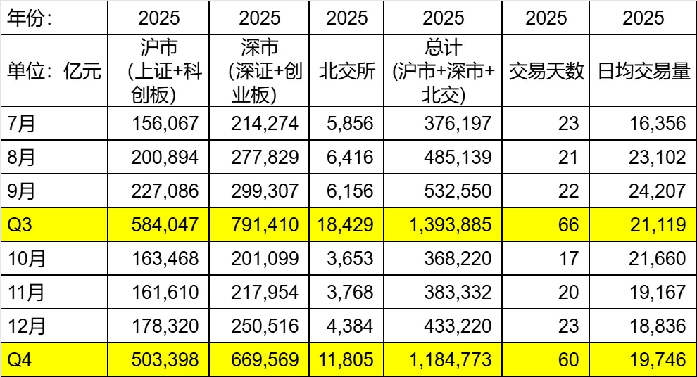 展望2026:券商的净利润能涨到何时?上一篇文章,我似乎泼了一点冷水,提到四季度券商的利润增长恐怕不如三季度这么强劲。今天我再来打打鸡血,展望一下2026年券商的业绩。2025年,券商两条腿在走路,一条是财富管理(收的手续费+融资融券的利息),另一条是自营投资业务。当然个别券商还能三条腿走路的,比如中金的投行业务占比也很大增长也很多。我最近想弄明白一个问题,券商的两条腿,到了2026年都还能高速增长吗?手续费还能收更多吗?两融余额同比还能大涨吗?手续费能不能收更多,相当于A股的成交量同比能否继续增长。我们先来看一下2025年上半年的成交量(数据来自于上交所、深交所和北交所的官网):2025年Q1日均1.5万亿,Q2日均1.2万亿。几乎可以断定,2026年上半年的手续费增长是无须担心的,就2026年前几个交易日的情况,就没有低于2.5万亿的。然后我们再来看看,融资融券的利息还能继续大幅增长吗?先看一下2025年上半年的两融余额如下(数据来自于上交所和深交所的官网):我们看一下1月7日的水平,下图来自上交所和深交所的截图:加在一起,两市的两融余额已经达到了2.6万亿。同比去年1月最后一个交易日,已经大幅度增长50%左右了。而且2025年前6个月两融余额其实体量都不到2万亿,今年上半年,两融的利息收入也将注定继续大涨。综上,券商业绩的第一条腿——财富管理(手续费+融资融券利息),将大概率在2026年上半年继续高速增长。下半年挑战会大很多,这是2025年下半年的交易金额数据:2025年Q3日均交易量已经达到2.1万亿,Q4也接近2万亿。那么2026年下半年,手续费同比还能不能增长,能增长多少,就要看当时的市场热度了。可以看到,2025年下半年的两融余额已经比较高了,基本都在2万亿以上。总的来说,2026年下半年的财富管理增速可能承压,我觉得应该还是会增长,但是增幅大概率会小于上半年。以上是第一条腿——财富管理的展望。从这个角度来说,像中国银河和广发证券这种经纪业务占比高的券商,至少在2026年的一季报和中报时,业绩增速的确定性很高。毕竟财富管理是市场好的时候,确定性最强的板块。那么财富管理业务是不是可以一直增长?理论上,市场上的水本来就是越来越多的,交易量也好,两融余额也好,本来就应该不断创新高,毕竟水本来就多了。但是当体量达到一定程度,增速就会放缓,期望券商的财富管理后面几年都以50%+的速度大幅上涨,是不现实的。即便慢牛真的实现,财富管理板块,应该也只会每年同比缓慢上涨。上一篇文章已经提到过,券商的自营投资可以说是不可预测的。但是当股市上涨时,大概率自营投资也是涨的。这里我就不多讨论了。整体来说,由于确定性很高的财富管理业务增速仍然将很可观,所以2026年我关注的银河、广发等券商业绩可期,分红仍然将大幅增长。