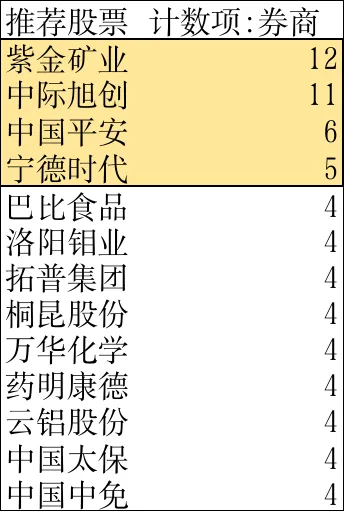 1.根据每月券商金股推荐标的,按照推荐次数由多到少进行排序;