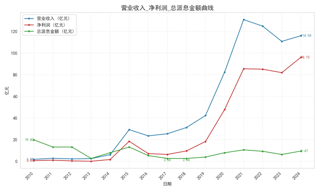 2024年分红率9.86%,较2023年7.74%回升,但低于2021年12.36%。2016年分红率高达74.09%,为近年峰值,此后逐年下降。近年每股派息稳定在0.06元左右,总派息随净利润波动。分红方案持续“10转2股派息”,送转稳定,现金分红意愿趋稳,高分红年份集中于2016年及以前。