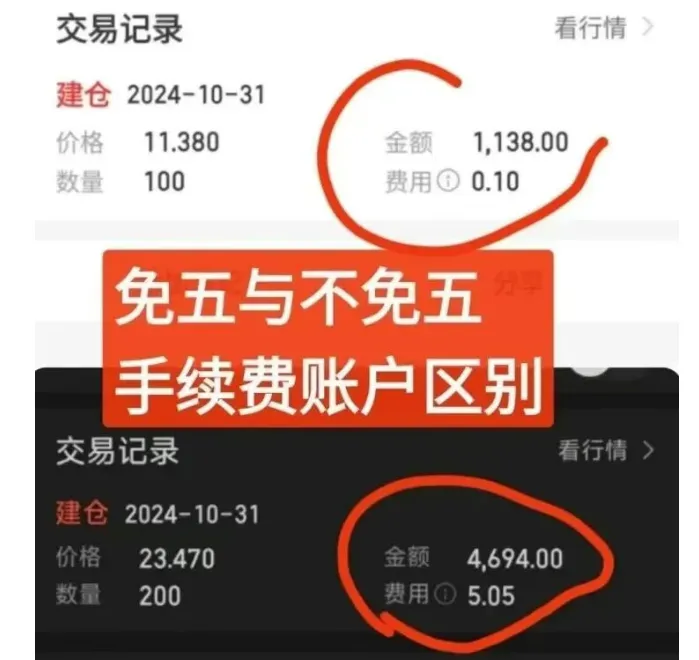 下图就是账户免不免五的直观区别, 所以炒股有时候不是你不行,是你输在了账户佣金贵,辛苦一年跟券商打工,总的交易手续费都几千上万,你还赚啥钱?