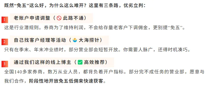 由于“免五”政策属于特殊渠道,各个券商的政策和名额也随时在变。为了给您提供最新、最匹配的方案,请通过下面的方式联系我详询。