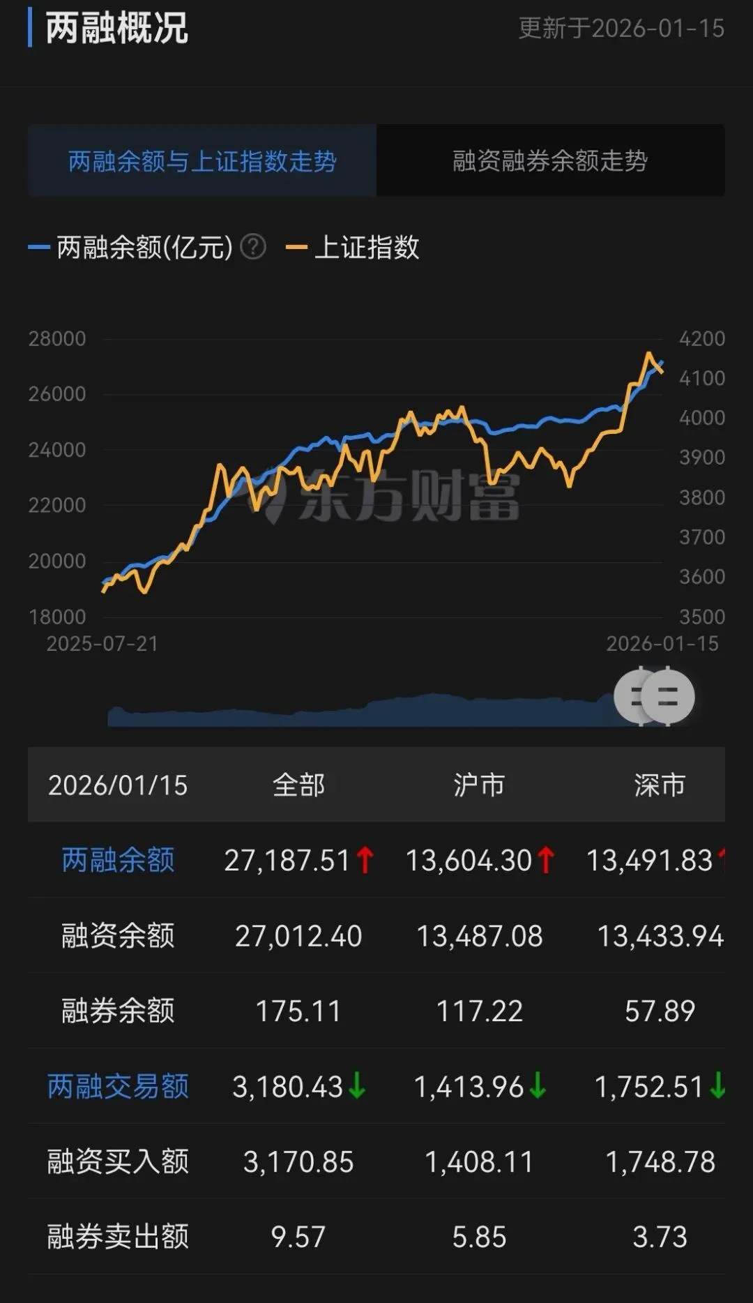 券商现金牛两融余额不是可用而是已用待还1月14日中午收紧两融的突发消息引发了A股的急剧跳水后,股民对两融的关注爆增。圆兔还指出了两融占比流动市值不到3%时踩刹车的用心良苦:目前A股两融占比流动市值不到3%,还可控。万一像2015年那样达到5%的杠杆玩到极致的高点,再去踩刹车就容易翻车了。“两融余额”(融资余额+融券余额)这个叫法容易让股民困惑。它虽然带着“余额”两个字,但指的并不是你账户里剩下还能用的额度。两融余额指的是已使用的额度,它代表市场上投资者通过融资融券业务已经借入但尚未归还的资金和证券的总额。这个叫法源于其金融统计本质。它指的是每个交易日结束后,投资者每日融资买进与归还借款间的差额的累计值。在会计和统计上,这种一段时间内未清偿的负债总额,就习惯被称为“余额”。所以,这里的“余额”更接近“未清偿金额”或“剩余负债”的概念,而不是我们日常生活中理解的“剩余额度”。两融余额就像一份“总欠条”,记录了整个市场在融资融券业务中总共欠券商多少钱和多少券。截止2026年01月15日,两融余额27187.51亿,占A股流通市值2.63%,两融成交额3180.43亿,占A股成交额10.81%。两融余额券是券商的现金牛,有点像银行钱生钱的贷款业务。媒体报道部分大中型券商的两融资金紧张。现在两融利率起步利率都在5%左右,大资金可以谈到4-4.5%,千万级大户可以往4%以下的谈。低利率大环境下,像东方财富前几年除了开户佣金和激进销售之外的第三条财路就是发债低息借钱,然后再两融借给股民赚息差。融资余额增加通常意味着借钱买股票的人多了,反映出市场乐观情绪占主导。融券余额增加则表示借股票来卖出(看空)的人多了,反映出市场谨慎或悲观情绪较浓。融券余额在A股两融余额中占比极低,因此两融余额确实主要反映了投资者“借钱买股票”(即融资)的热情和市场情绪。当两融余额持续增加时,说明有更多投资者愿意借钱买入股票,普遍反映出市场乐观情绪较浓,看多后市。当两融余额下降时,则表明投资者在减少杠杆,偿还借款,可能意味着市场情绪趋于谨慎。需要注意的是,过高的两融余额也意味着市场杠杆水平较高,可能会加剧市场的波动风险。(圆兔投资实录合集新文章发布前圆兔值得记录的操作和感悟会在下方留言区发布。)