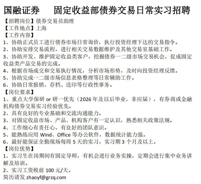 券商社招&实习 | 国融证券固收部最新招聘信息