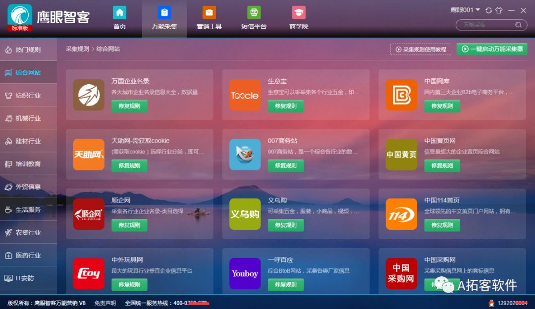 1、采集客源。目前对接的全网各大渠道,如:八大地图(百度、腾讯、高德)、阿里、慧聪、顺企、工商等等,将近200个,实时采集抓取。只需要设置地区、关键词,即可抓取全国各地的厂家、经销商、公司、门店信息。
