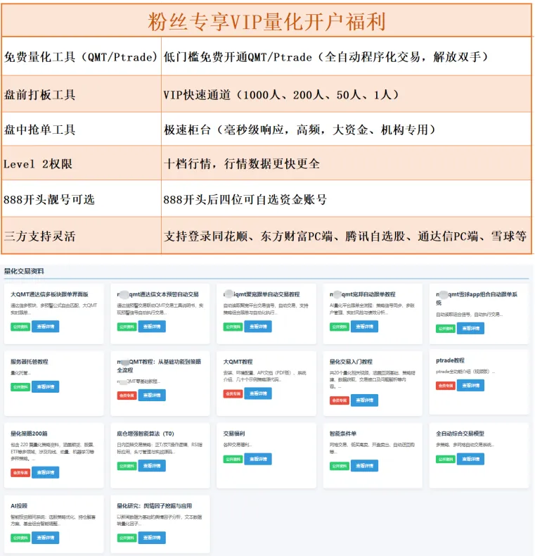 获取国金证券量化交易接口(QMT/Ptrade)只需简单几步(找我开户→入金XX→申请量化实盘接口QMT/Ptrade)。还提供量化学习资料、量化问题答疑、量化交流群及更多量化支持服务: