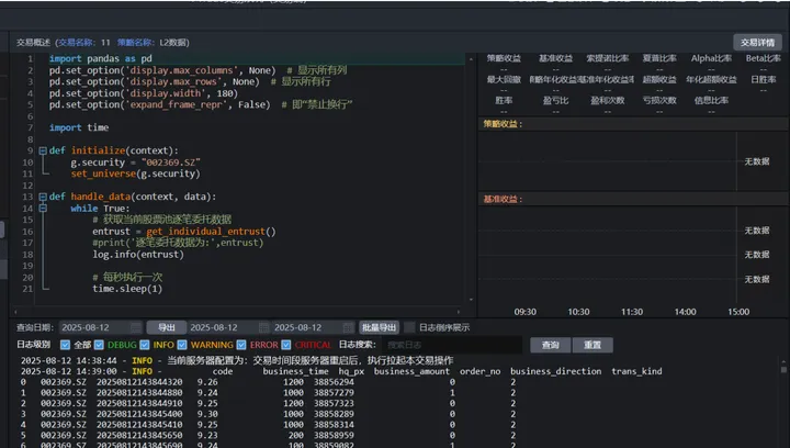 全量数据支持 + 灵活算法:实时行情、历史数据、财务数据一应俱全,适配不同品种的数据分析需求;内置标准算法、随机量交易,大额交易也能隐藏行踪,足以满足我们个性化需求。