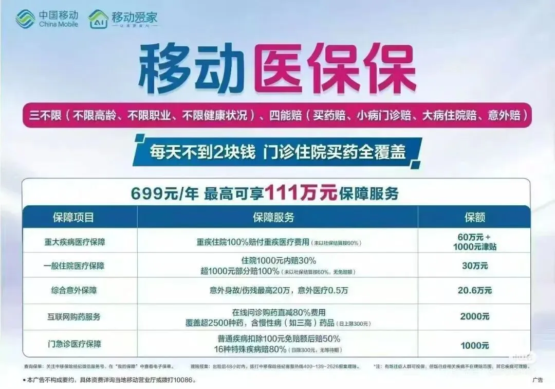 先说说中国移动!它这次是和平安一起搞的,出了个叫“移动医保保”的医疗险。一年保费才699块,算下来一天还不到2块钱,简直跟喝瓶矿泉水差不多!能保的东西还挺全:住院、门急诊、意外都涵盖,就连在线问诊买药都能直减80%,“三高”这类慢性病的药也能报,每天最多能报300块。最绝的是,不限年龄、不限职业,就算之前有过生病史也能投保,门槛是真的低!