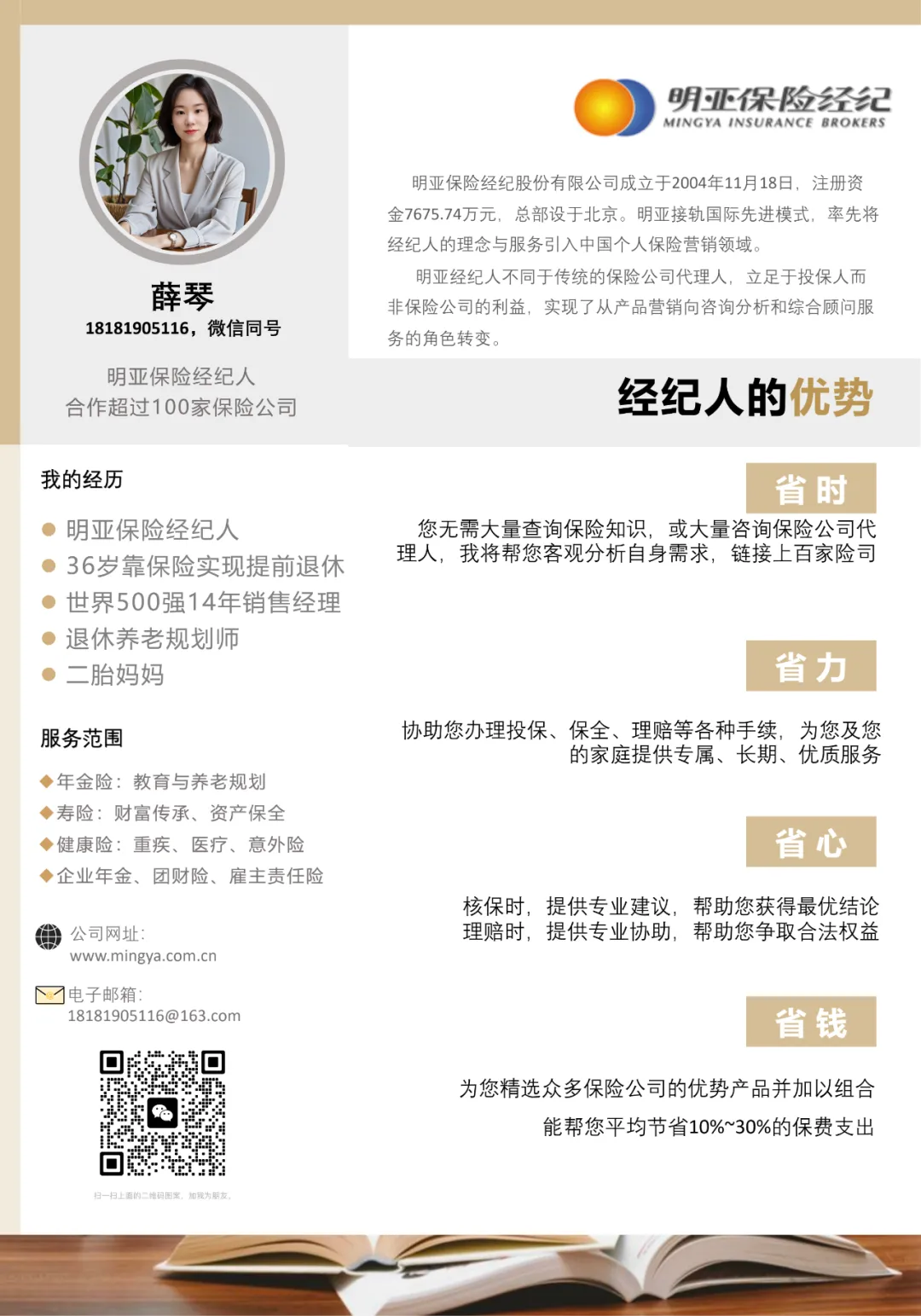 擅长家庭全案保险规划,尤其擅长医疗险/储蓄险/养老规划