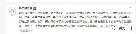 这则网传的爆料声称:“今年股票市场行情不好,研究所佣金普遍下滑。为了鼓舞士气,国金研究所开了内部工作会,研究总监唐川表示要带领大家去冲派点,并且认领了2000万元的佣金任务,而且要全部分给研究员。前天,研究所公布了发给公募基金的派点表,唐川把自己的名字放在所有行业组的第一位去了。原来他完成任务的办法就是把所有行业组的派点都搜刮一点,积少成多。”