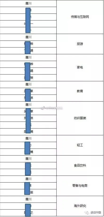 不过,网上还传出一张“派点表”,研究总监唐川的名字在9个行业组中占据第一位,包括传媒与互联网、旅游、家电、教育、纺织服装、轻工、食品饮料、零售与电商、海外研究这9个行业。