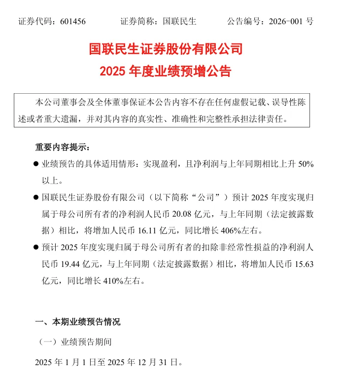 1月18日下午,国联民生发布《2025年度业绩预增公告》。公司预计2025年度实现归属于母公司所有者的净利润20.08亿元,与上年同期(法定披露数据)相比,将增加16.11亿元,同比增长约406%。此前,中信证券、西南证券分别披露业绩快报、业绩预告,2025年受益于资本市场活跃,各项业务显著增长,业绩得以提升。其中,中信证券2025年净利润达300.51亿元。国联民生披露的公告显示,预计2025年度实现归属于母公司所有者的扣除非经常性损益的净利润19.44亿元,与上年同期(法定披露数据)相比,将增加15.63亿元,同比增长约410%。针对本期业绩预增的主要原因,国联民生表示,报告期内,公司完成通过发行A股股份的方式收购民生证券股份有限公司控制权,平稳有序推进公司原有业务与民生证券相关业务的高效整合,并将其纳入财务报表合并范围。公司主动把握市场机遇,积极探索科技、金融与产业的深度融合,以“协同赋能”和“内生增长”为主线提升综合金融服务能力,证券投资、经纪及财富管理等业务条线实现显著增长,同时由于上年同期比较基数较小,本期经营业绩同比大幅提升。1月14日晚,中信证券发布2025年度业绩快报,2025年公司营业收入为748.30亿元,同比增长28.75%;净利润达300.51亿元,同比增长38.46%。1月15日晚间,西南证券发布2025年度业绩预增公告称,预计2025年度实现归母净利润10.28亿元到10.98亿元,较2024年将增加3.29亿元到3.99亿元,同比增长47%到57%;预计扣非后净利润10.13亿元到10.82亿元,较2024年将增加3.24亿元到3.93亿元,同比增长47%到57%。对于业绩增长的原因,这两家券商均表示,受益于资本市场活跃,公司各项业务实现较快增长。西南证券表示,在资本市场活跃度回升带动下,公司积极主动把握市场机遇,核心业务板块经营表现良好,其中财富管理业务、证券投资业务、投资银行业务同比大幅增长,推动公司整体经营业绩显著提升。中信证券表示,2025年国内资本市场整体呈上行态势,市场交投活跃度显著提升,投资者信心增强,A股主要指数均实现上涨。公司积极把握市场机遇,稳步做大客户市场规模,经纪、投资银行、自营业务等收入均实现较快增长。同时,公司坚定推进国际化布局,深化跨境服务能力,叠加香港市场的良好表现,公司境外收入实现较快增长。在机构人士看来,当前券商板块估值水平较低,正迎来基本面与估值双重修复的重要窗口期,行业景气度有望延续。开源证券非银首席分析师高超表示,券商行业监管政策进入“积极”周期,投行、公募基金和海外业务有望接棒传统业务,支持证券行业2026年盈利景气度。当下券商板块估值和机构持仓仍在低位,看好券商板块戴维斯双击,短期看业绩预告和政策端有望带来催化。招商证券表示,当下券商板块估值仍然滞涨、持仓水平仍低,这与券商板块的政策回暖带来的业绩增厚潜力并不相符。往后看,伴随指数持续上攻,应该高度重视券商板块的看涨期权属性,建议坚定持有。高超建议,投资者可关注券商板块的三条主线:一是国际业务优秀且低估值的头部券商;二是大财富管理优势突出的券商;三是零售优势突出、受益于海南跨境资管试点的券商。