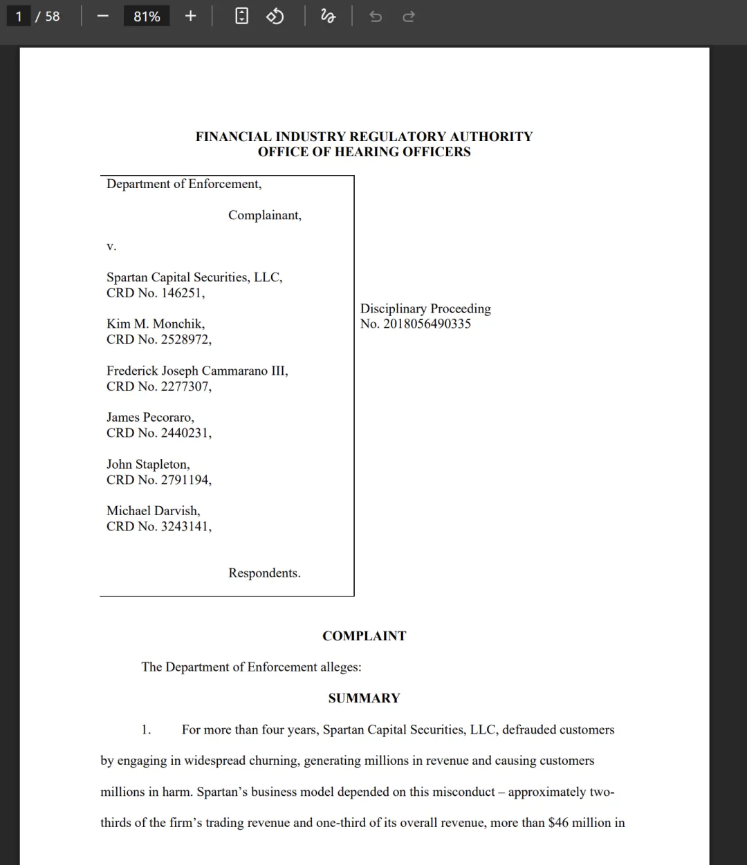 起诉指控,通过频繁交易客户账户,Spartan、Pecoraro 及 Stapleton 故意违反《1934 年证券交易法》第 10(b) 条及其下的 10b-5 规则,并违反 FINRA 规则 2020 及 2010。通过过度交易客户账户,Spartan 及被告代表故意违反Reg BI(2020 年 6 月 30 日及之后行为);Spartan、Pecoraro 与 Darvish 违反 FINRA 规则 2111(2020 年 6 月 30 日前行为,以及该日之后针对两个非零售客户账户的行为);Spartan 及被告代表亦违反 FINRA 规则 2010。