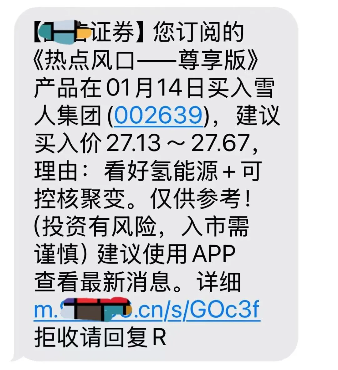 上图是航天发展的k线图,该股第一波段拉出5个涨停后,营造第一个横盘平台,反复上下震荡,怀疑可能是震仓。第二波大涨后,主力的真实意图无疑就是出货了(每天都低开,然后往上拉,给散户上车机会),营造了第二个横盘平台,然而主力发现并没有找到足够的散户来接盘,于是再拉出一波大涨行情,给未上车的股友一个大大的踏空心态。高位股票主力要想成功派发筹码,还有一招,那就是让券商荐股(有些券商可能也深陷其中急于派发),众多散户其实并没有太多的股票投资基础知识,他们投资股票的依据,很多就依靠券商投资顾问的建议。券商的投资顾问,会怎么荐股呢?股友给我发的一张券商投资顾问向他荐股的信息显示,1月14日券商给他推荐雪人集团。雪人集团股票k线图显示,1月14日正是该股典型头部形态明确的第二天,我那个股友听信券商的推荐,当天收盘价26.92买了8000股,吃到第二、三天连续两个跌停板,损失4万多块。玩股票,想要赚到钱,不能听信外面的消息买股,更不能依靠券商荐股,得自己知道识别股票头部形态,自己会分析股票趋势,根据趋势炒股,让自己成为行业专家,才有可能在A股长期稳定地赚到钱。