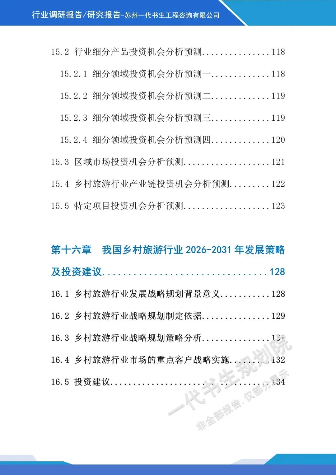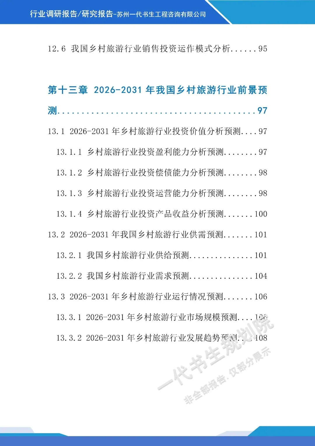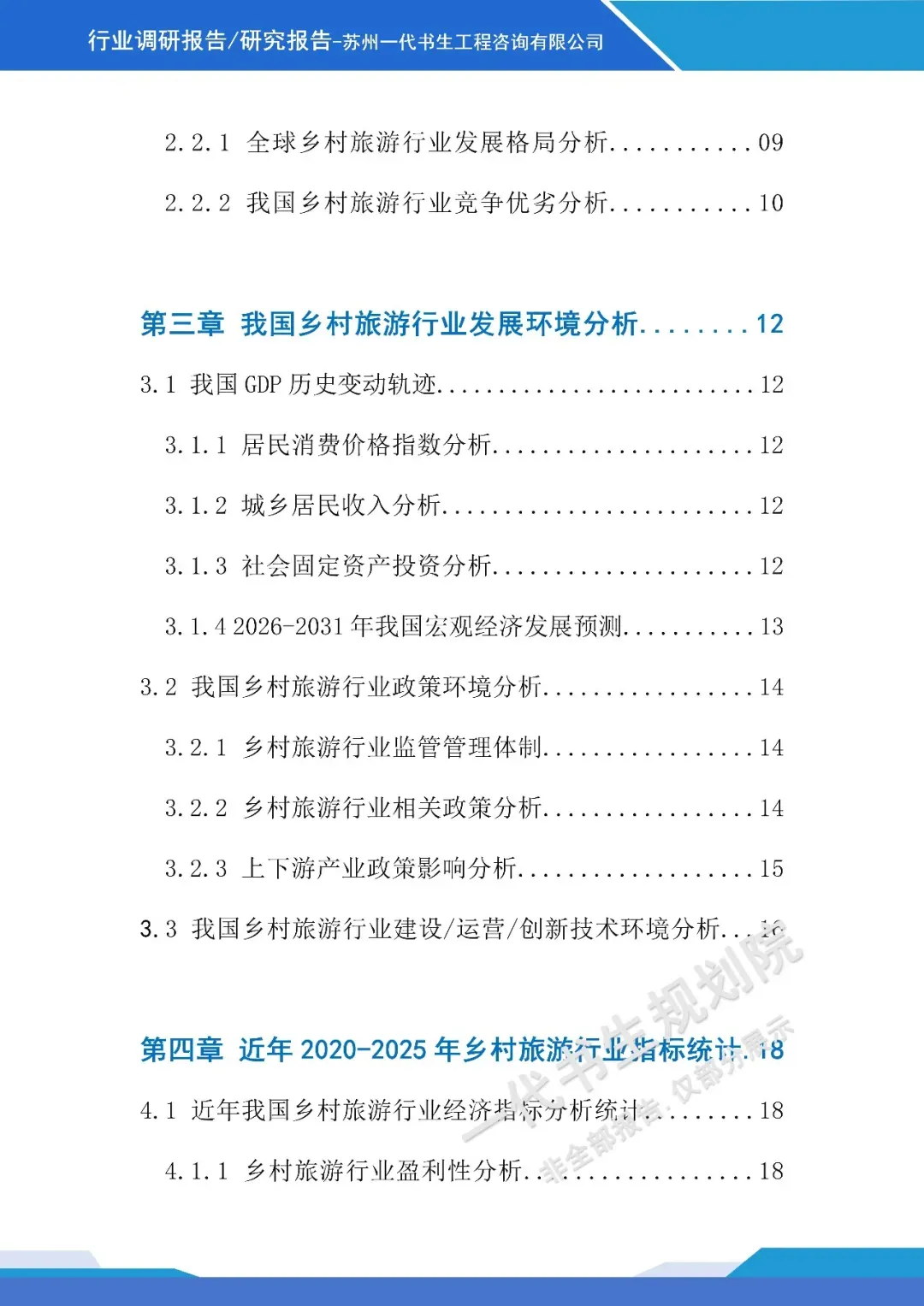 《2026年-2031年我国乡村旅游行业市场分析调研报告》【二】行业调研报告编制说明本报告由苏州一代书生工程咨询有限公司编制,聚焦2026-2031年我国乡村旅游行业发展周期,深度洞察行业发展脉络与未来走向。报告立足乡村振兴战略深化与城乡融合发展的宏观背景,精准把握消费模式改变下乡村旅游市场的需求变革,系统剖析行业发展的核心驱动因素与潜在挑战。调研内容涵盖乡村旅游产品业态创新、区域发展格局演变、文旅融合路径探索、智慧技术应用趋势等核心维度,同时兼顾政策环境解读、市场主体竞争态势及产业融合模式等关键议题。报告摒弃单一数据堆砌,通过多维度逻辑推演与趋势预判,梳理乡村旅游从观光型向深度体验型转型的核心逻辑。作为专业咨询成果,本报告为行业投资者、运营主体、政策制定部门提供兼具前瞻性与实操性的决策参考,助力精准把握行业发展机遇,推动乡村旅游行业实现高质量、可持续发展,为乡村振兴与共同富裕目标的实现提供产业支撑。项目可行性研究报告定制、行业市场调研报告购买,联系电话:17312436919。产业规划咨询、概念规划设计