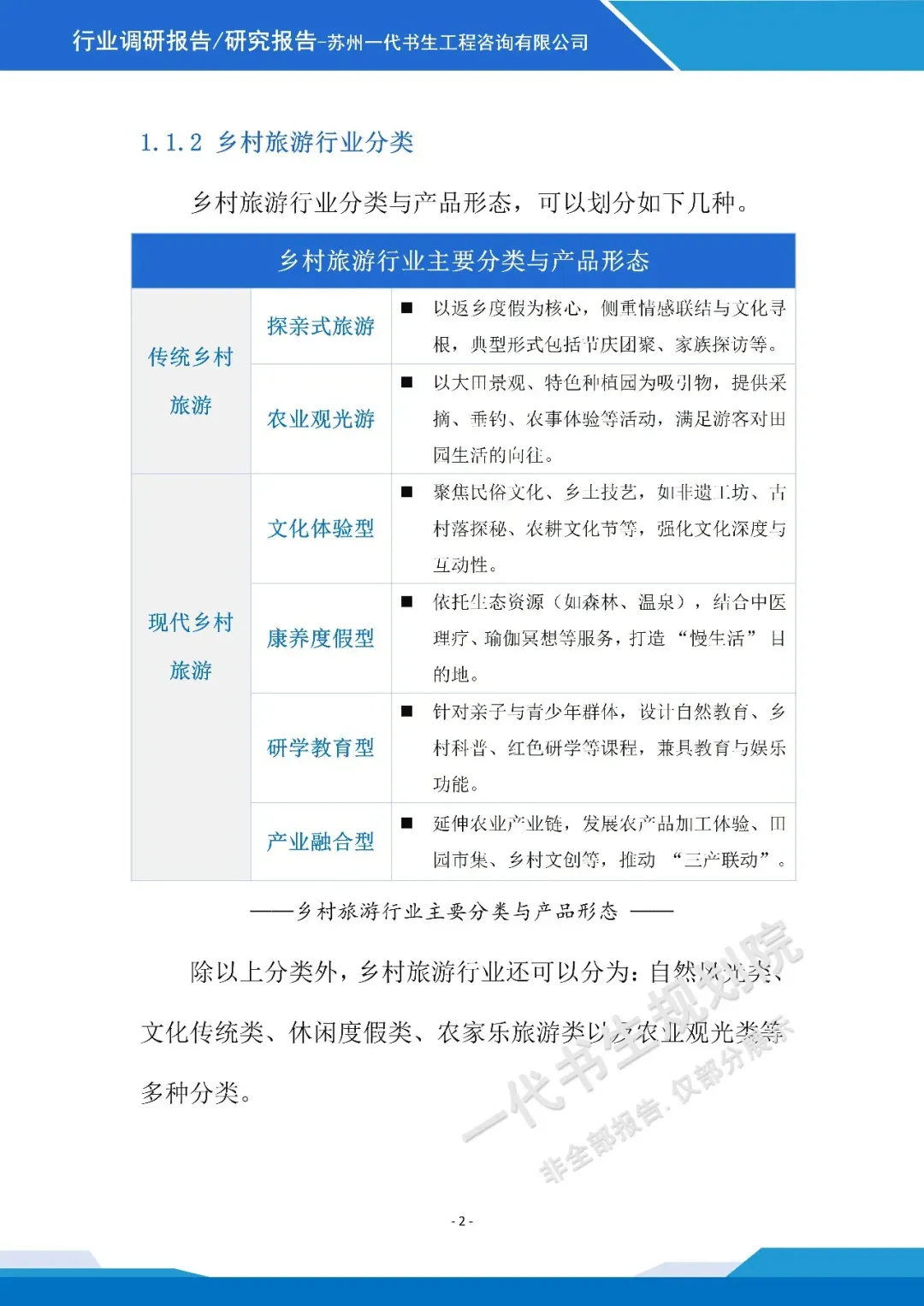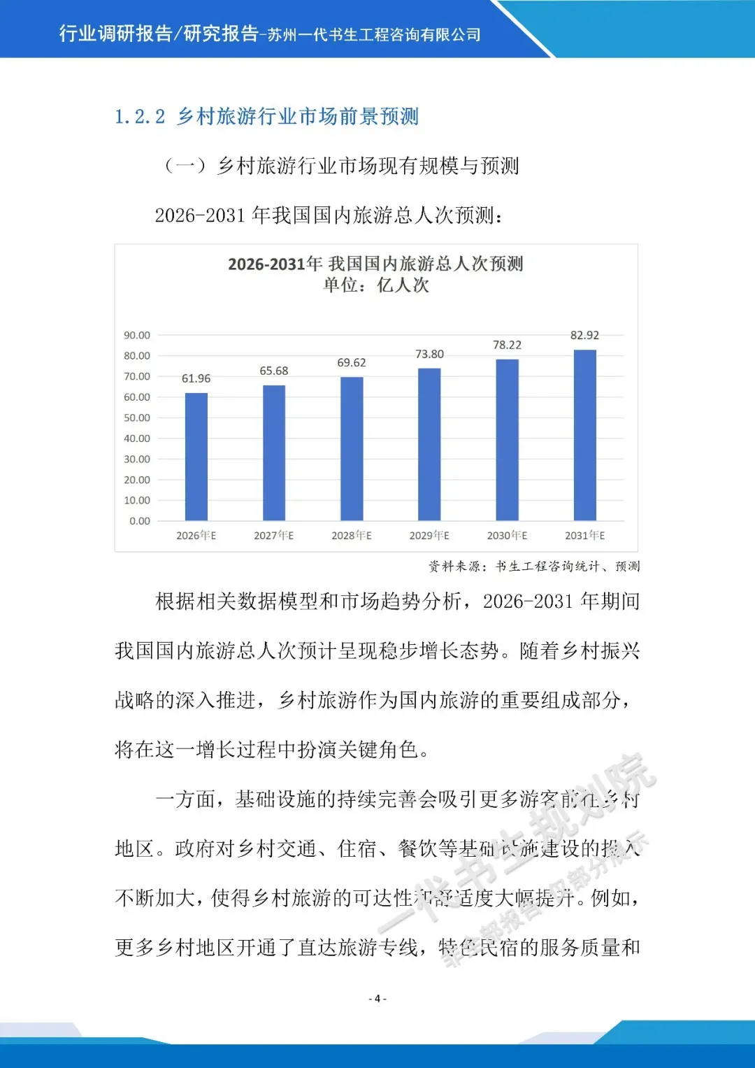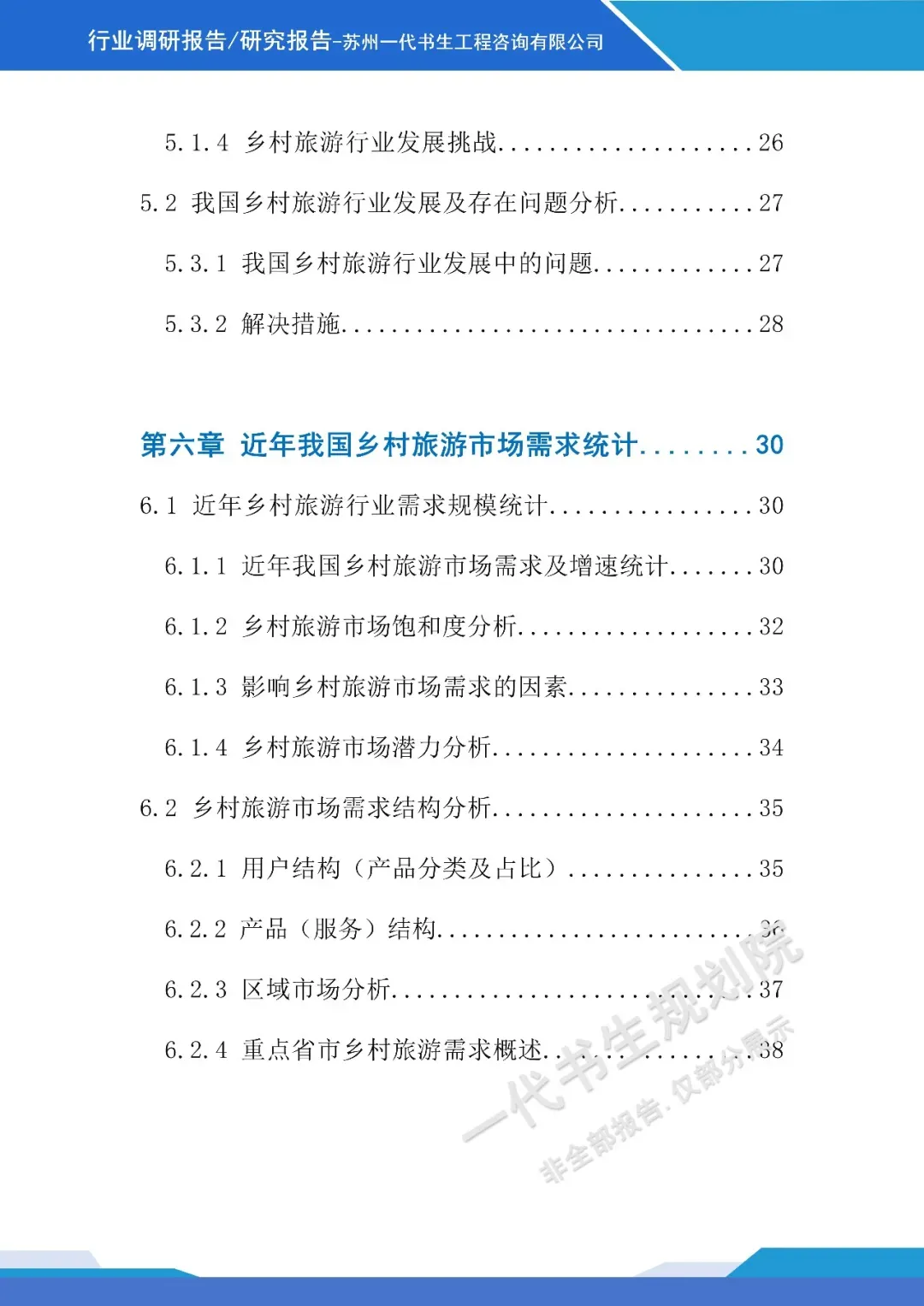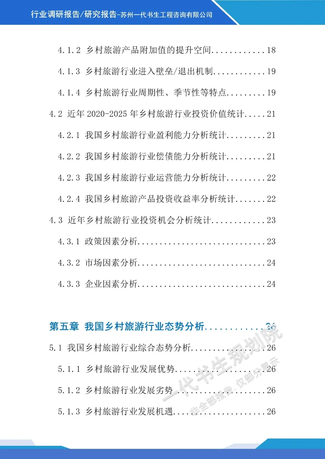 《2026年-2031年我国乡村旅游行业市场分析调研报告》【二】行业调研报告编制说明本报告由苏州一代书生工程咨询有限公司编制,聚焦2026-2031年我国乡村旅游行业发展周期,深度洞察行业发展脉络与未来走向。报告立足乡村振兴战略深化与城乡融合发展的宏观背景,精准把握消费模式改变下乡村旅游市场的需求变革,系统剖析行业发展的核心驱动因素与潜在挑战。调研内容涵盖乡村旅游产品业态创新、区域发展格局演变、文旅融合路径探索、智慧技术应用趋势等核心维度,同时兼顾政策环境解读、市场主体竞争态势及产业融合模式等关键议题。报告摒弃单一数据堆砌,通过多维度逻辑推演与趋势预判,梳理乡村旅游从观光型向深度体验型转型的核心逻辑。作为专业咨询成果,本报告为行业投资者、运营主体、政策制定部门提供兼具前瞻性与实操性的决策参考,助力精准把握行业发展机遇,推动乡村旅游行业实现高质量、可持续发展,为乡村振兴与共同富裕目标的实现提供产业支撑。项目可行性研究报告定制、行业市场调研报告购买,联系电话:17312436919。产业规划咨询、概念规划设计