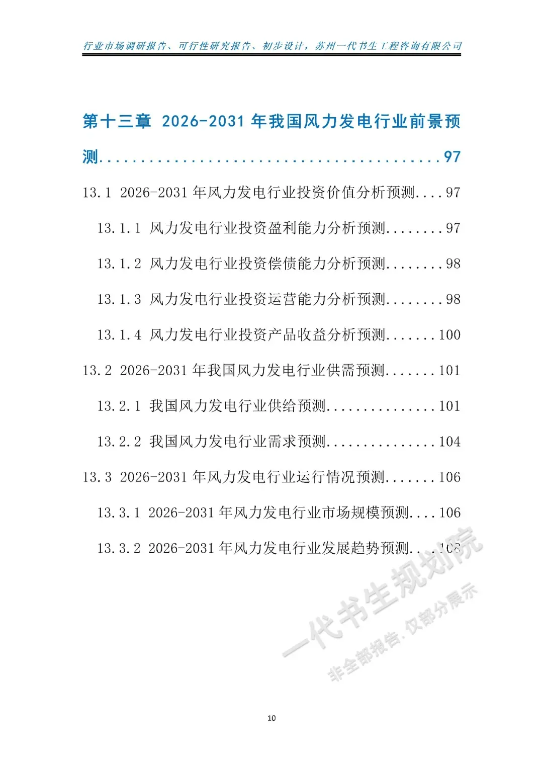 《2026年-2031年我国风力能源产业市场发展趋势分析预测报告》【二】行业调研报告编制说明本报告由苏州一代书生工程咨询有限公司编制,聚焦2026-2031年我国风力发电行业发展周期,深度洞察行业发展脉络与未来走向。报告立足新型能源体系构建与绿色低碳转型的宏观背景,紧扣高质量发展与能源安全保障的核心要求,精准把握产业升级下风力发电市场的需求变革,系统剖析行业发展的核心驱动因素与潜在挑战。调研内容涵盖风力发电技术创新迭代、陆海场景布局演进、全产业链协同发展、绿电融合应用拓展等核心维度,同时兼顾市场主体运营态势、装备制造升级及安全稳定运行等关键议题。报告摒弃单一数据堆砌,通过多维度逻辑推演与趋势预判,梳理风力发电行业从补充能源向主力能源转型的核心逻辑。作为专业咨询成果,本报告为行业运营主体、技术研发机构、能源消费单位提供兼具前瞻性与实操性的决策参考,助力精准把握行业发展机遇,推动风力发电行业实现高效、智能、可持续发展,为完善新型能源体系、支撑经济社会全面绿色转型提供产业支撑。项目可行性研究报告撰写、行业市场调研报告购买或专属定制,联系电话:17312436919。产业规划咨询、概念规划设计