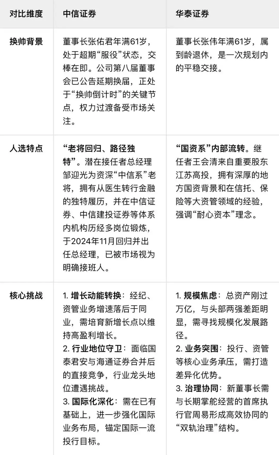 华泰证券的权力交接更为明朗。现任董事长张伟在2024年11月已年满60岁,目前已“超期服役”一年多。此次权力交接属于规划内的平稳交接,公司治理结构稳定,过渡预期清晰。