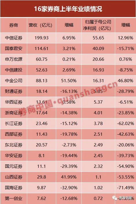 就目前发布的16家上市券商半年报来看,仅有中金公司、中信证券和申万宏源证券三家券商归属于母公司的净利润实现正增长。作为龙头券商,中信证券深受政策倾斜等利好因素,在监管“扶优限劣”的大背景下,上半年归属于母公司的净利润实现了两位数的增长。