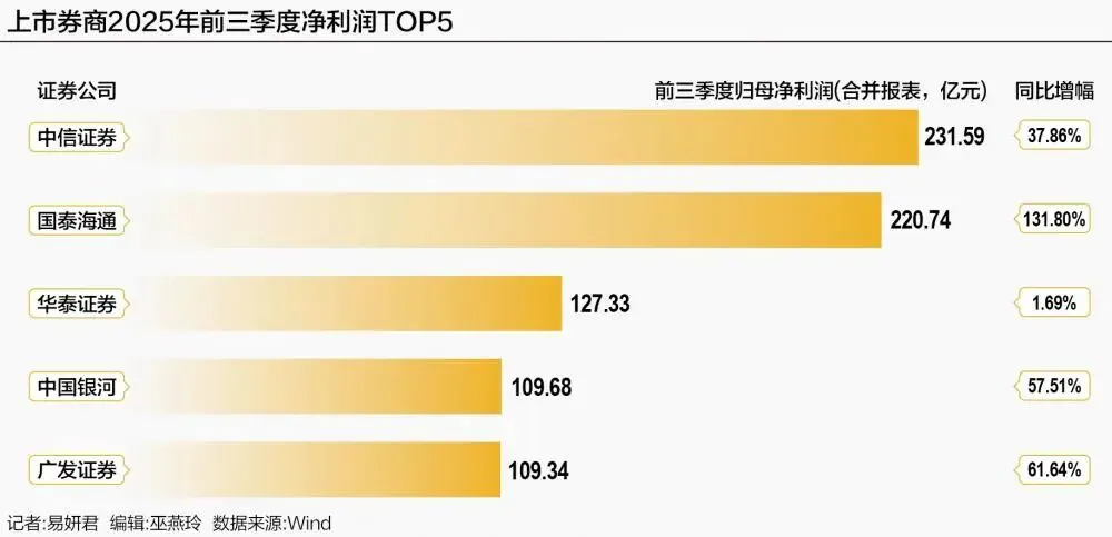 10月30日晚间,A股42家上市券商全部披露了2025年三季报。据Wind统计,今年前三季度,中信证券、国泰海通、华泰证券、中国银河、广发证券分别实现净利润231.59亿元、220.74亿元、127.33亿元、109.68亿元、109.34亿元,排名行业前五。