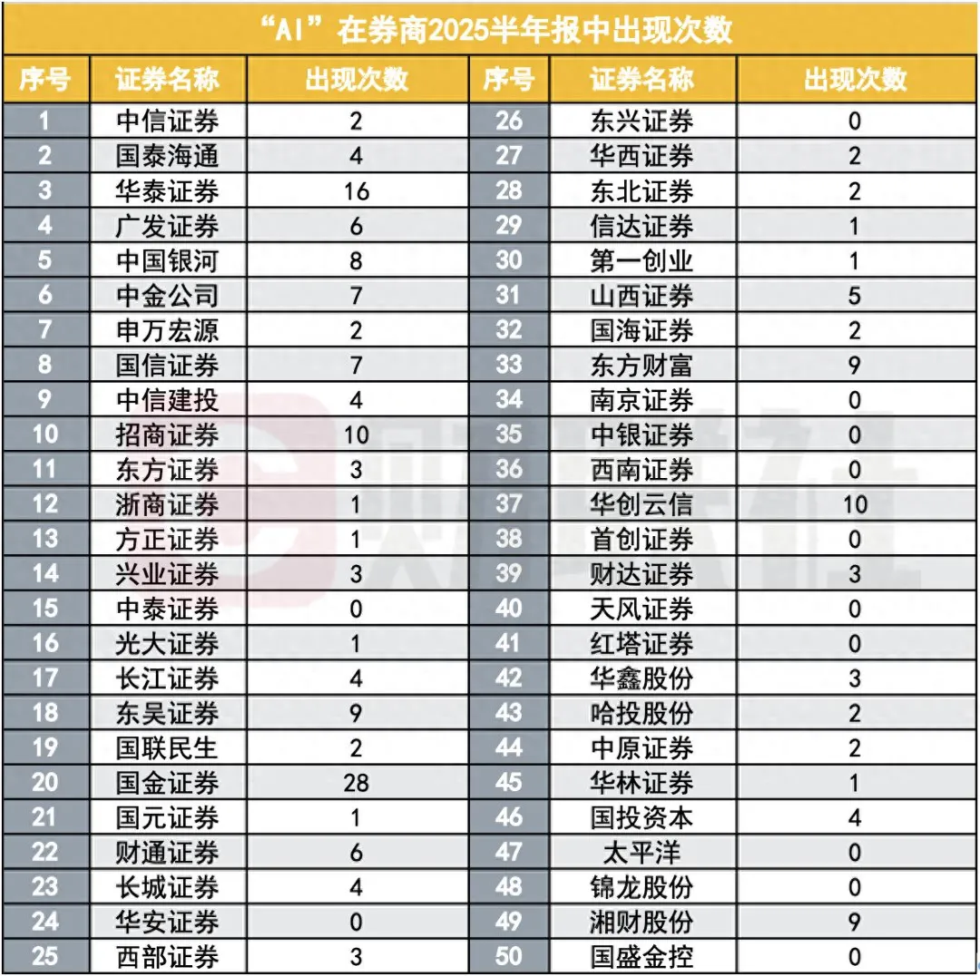 可以确认的是,AI+金融未来的角逐只会更加激烈。据悉,早在2024年,就有8家券商在信息技术领域投入金额超过10亿元,财联社记者统计,单“AI”一词在50家上市券商2025上半年报中共出现188次,平均每家券商提及3.76次。大型券商计划2026年继续推AI化APP,中小券商也将其纳入规划。