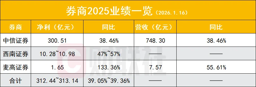 截至1月16日,已有3家券商披露业绩,均实现业绩的快速增长,具体净利增速情形为中信证券(38.46%)、西南证券(47%~57%)、麦高证券(133.36%),净利规模分别为300.51亿元、10.28亿元至10.98亿元、1.65亿元。