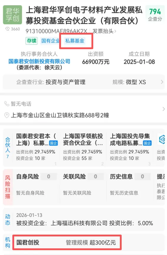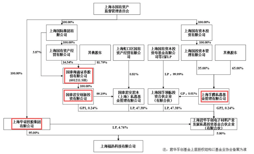 上海福迅科技主要股东为:上海华谊控股持股95%,上海君华孚创电子材料产业发展私募投资基金合伙企业(有限合伙)(简称“上海君华孚创”)持股5%,其中,上海君华孚创为国泰君安创新投资有限公司(券商私募子)设立的私募基金产品。
