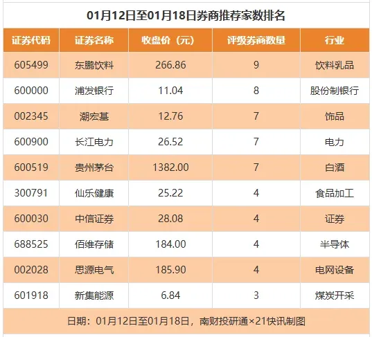 据南财投研通数据,1月12日至1月18日有191家上市公司得到券商推荐,其中贵州茅台等获得7家推荐。