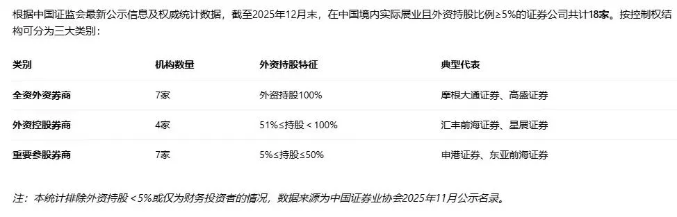 截至2025年12月末,根据中国证监会公开信息及市场机构统计,在中国展业的外资券商(含独资、控股及合资券商机构)约18家左右。具体数量会因股权变更、新牌照获批或业务整合而动态调整。