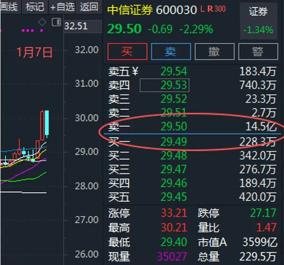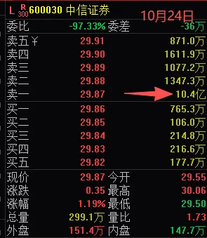 尾盘,中信证券、国泰君安等龙头被巨量卖单精准压制,股价被按在-1%附近。