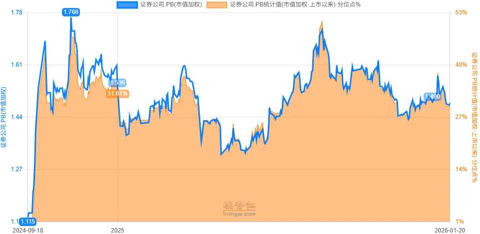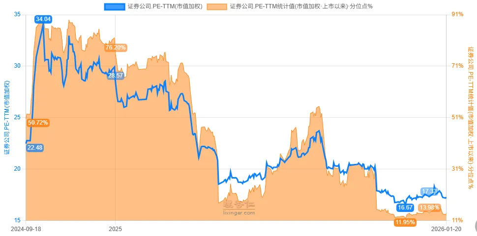 目前券商板块PE只有17倍,比历史上86%以上的时间都便宜,