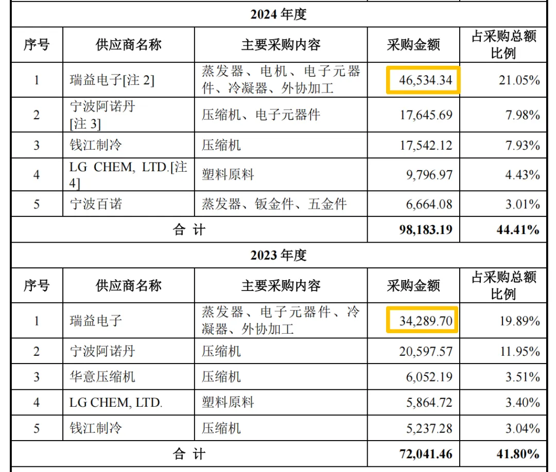 且看曾最为重要的压缩机供应商——华意压缩机,地位岌岌可危,2024、2025年的前五大供应商名单中,已然消失不见。