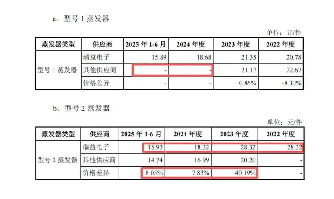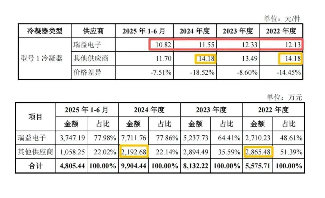 再看其中价格,猫腻更明显。比如型号2蒸发器,瑞益电子的报价竟能比其他供应商高出40.19%。在正常情况下,这足以构成切换供应商的全部理由,然而现实是惠康科技不仅继续采购,其采购份额还在这种高价下持续攀升。