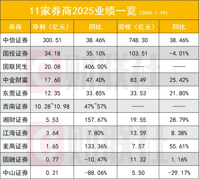 数据显示,上述券商无一亏损,合计实现净利润406.8亿元至407.5亿元,同比增幅区间达43.59%至43.83%;9家券商净利正增长,占比超八成,其中3家增速翻倍,龙头中信证券更是以300.51亿元净利突破300亿大关。