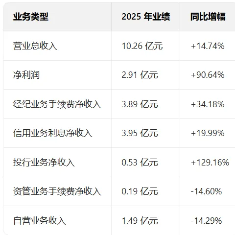 母公司利润表显示,粤开证券2025年营业总收入10.26亿元,同比增长14.74%;净利润为2.91亿元,同比增长90.64%。主营业务中,经纪、投行和信用业务同比上升,自营和资管业务则有所下降。
