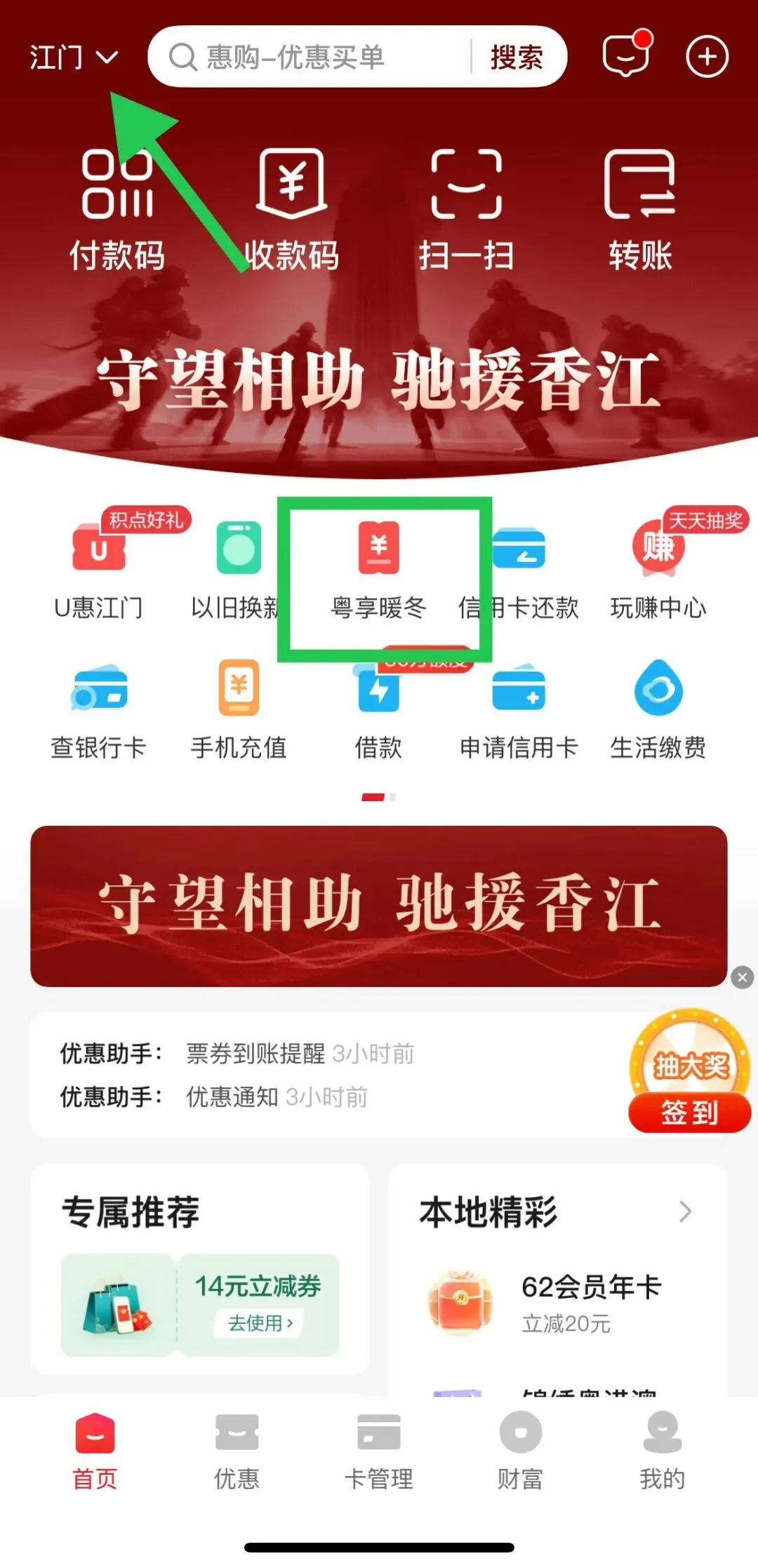 2.打开定位设置,确认云闪付APP左上角定位在“江门市”;