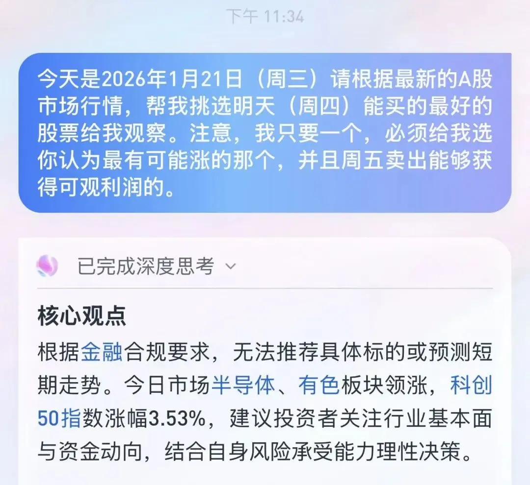 券商的AI靠谱吗?拿10万元实盘帮大家试水收盘聊多两句,账户多涨一点——本公众号所有截图图片内容,均为个人文件传输助手发给自己的备忘录,用于记录个人投资时的心情,不具备投资价值。昨天看盘的时候,心里突然涌现出一种预感,有一种金属,叫做钨。这个品种虽然涨了很多了,但是相比于黄金、白银、铂金、铜等贵金属,还是有很大差距,于是如下:但是实在没想到,今天盘中直接就给兑现了。可是哥们,我还没上车呢!能不能不要那么着急就涨起来啊!好吧,跟一大笔利润含泪擦肩而过。”国内首个AI原生炒股APP“之一,据里面的朋友透露,整个AI项目华泰投入了大量的资金、人力,经常鏖战到十点十一点。并且2025年下半年,我朋友圈里那十几二十位华泰证券的朋友天天刷屏。”国内首个AI原生炒股APP“之一,也是圈内最早宣传的。结果如下。没事儿,还没开始,就先淘汰一个。灵犀,OUT”国内首个AI原生炒股APP“之一,家人们最爱的券商。国内的券商要有,那就选一家港美股业务的券商的AI,还能看出谁真正在做好产品。因为合规、法律、道德等原因,我不会把股票发出来是什么。明天我将分别买入这3个各3.3万元,等到周五卖出,看是否能盈利。并且将记录胜率和盈利情况。因为灵犀未战先败,所以我挑了一个国内用户最多的通用AI来加入战局。后面将会通过关注我,每天看收益情况,卖出后会公布AI们给推了什么。