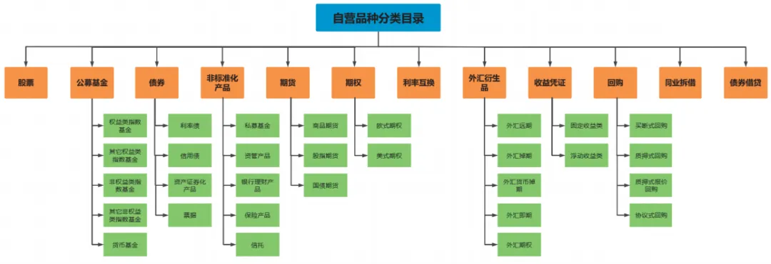 2. 监管数据统一分类与治理。参考SDOM模型的品种分类体系,并结合中国证监会证券经营机构数据报送、人民银行金融机构资产负债、中证报价收益凭证报送、中证协场外债券报送、外汇管理局金融机构资产负债等多套监管报送要求,系统性梳理、提取并整合,最终形成具备监管特色的品种分类目录。图2展示的是自营品种分类目录。