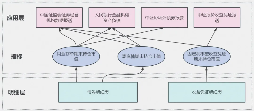1. 保障监管多头报送指标的一致性。在监管报送实践中,往往存在同一指标向多个监管机构分别报送的情形。例如,“债券-同业存单月末持仓市值”需同时报送至中国证监会证券经营机构数据报送的《自营投资情况报表》和中证协场外债券报送的《场外现券持仓报表》。依托于统一构建的监管报送数据底座,实现了明细层数据的跨任务复用,严格确保同一指标“数出同源”,从机制上保障了跨监管报送数据的一致性与准确性。