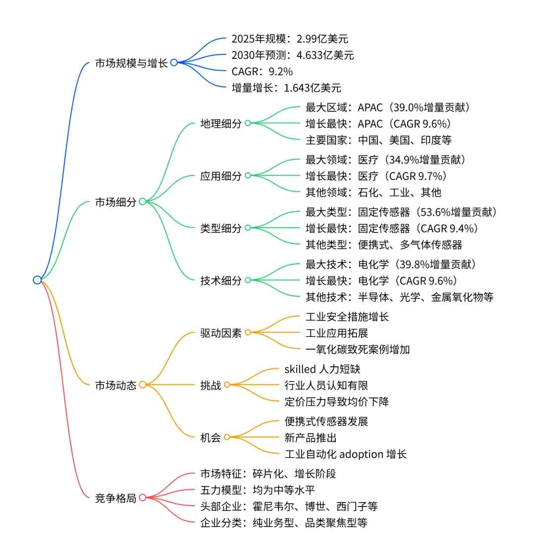 2025-2030 年全球一氧化碳气体传感器市场呈加速增长态势,2025 年市场规模为 2.99 亿美元,2030 年将达 4.633 亿美元,CAGR 为 9.2%,增量增长 1.643 亿美元;APAC 是最大且增长最快的区域(CAGR 9.6%),医疗领域是最大且增长最快的应用领域(CAGR 9.7%),固定传感器是主流产品类型(占 2025 年市场份额 51.8%),电化学技术主导市场(CAGR 9.6%);市场驱动因素包括工业安全措施升级、应用场景拓展等,挑战有 skilled 人力短缺等,竞争格局呈碎片化,头部企业有霍尼韦尔、博世等。