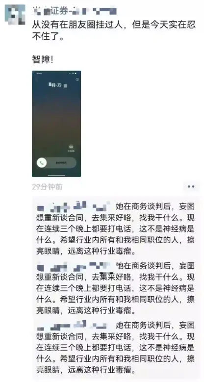 券商员工怒了!网传的截图,来自于@Momo,一券商员工,怒怼金融数据公司的领导【应该是wind】:商务谈判之后妄图重新谈判,连续三个晚上都要打电话。1、不少人吐槽这家数据公司,定价很霸道,不停的涨价,但是你不集采了,他们就是免费送账号。价格非常高,人手一个账号的话,又推高了券商的成本。2、原作者朋友圈连发三次,表达了作者的愤怒之情和对数据公司领导的不满。