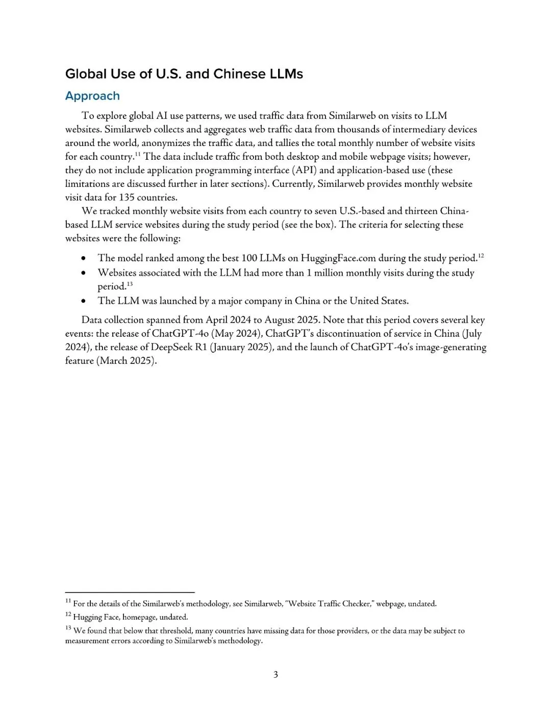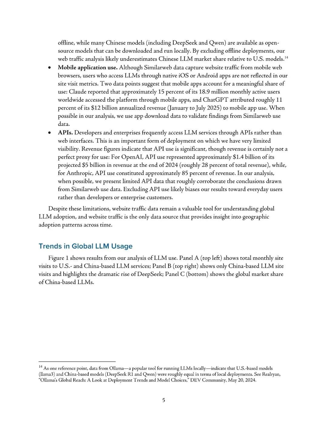 中国市场的竞争优势则体现为"政策-成本-开源"的系统性反击能力。最显著的是价格优势:中国模型API定价仅为美国竞品的1/6至1/4,DeepSeek R1每百万token输入成本0.55美元,而ChatGPT高达2美元。尽管98%用户使用免费版本使价格敏感度暂时钝化,但在企业级市场和价格敏感的发展中国家,这一差距将成为长期渗透的利器。开源战略更是颠覆性变量:DeepSeek、Qwen等模型支持本地部署,Ollama平台数据显示中美模型在离线环境部署量已持平,而Similarweb等网页统计工具完全无法捕捉这部分流量,意味着中国模型的实际市场份额被系统性低估。政策层面,中国政府将AI基础设施定位为"水电煤气"般的公共品,通过补贴训练成本、算力资源和电力消耗,支撑企业以超低价甚至免费策略抢占市场,这种国家意志驱动的长期投入是美国纯市场化模式难以匹敌的。