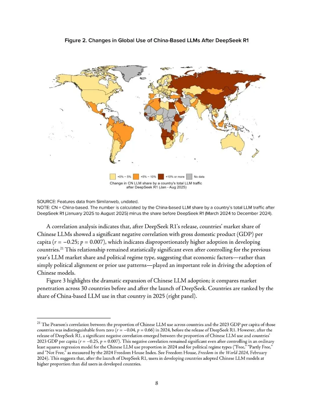 地缘政治因素正在重塑AI市场的自然选择。DeepSeek的增长呈现显著的"南升北降"格局:在中东、非洲、拉美及俄罗斯等地区,市场份额增幅超过10%,而这些地区要么人均GDP较低,要么与中国存在紧密的政治经济纽带;相反,美国盟友体系和北约国家增幅普遍低于5%。相关性分析显示,DeepSeek发布后,中国模型市场份额与人均GDP呈现显著负相关(r=-0.25),这在2024年并不存在,说明经济因素而非政治站队成为核心变量。这种现象背后,是发展中国家对低成本、可定制、无西方意识形态审查的AI工具的现实需求。与此同时,中国大使馆在2024-2025年间发布了401项AI合作声明,覆盖1257个国家人次,远超美国的304项和473个国家人次,这种"AI外交"虽不能直接驱动个人用户选择,却为政府项目和大型企业采购铺平了道路。