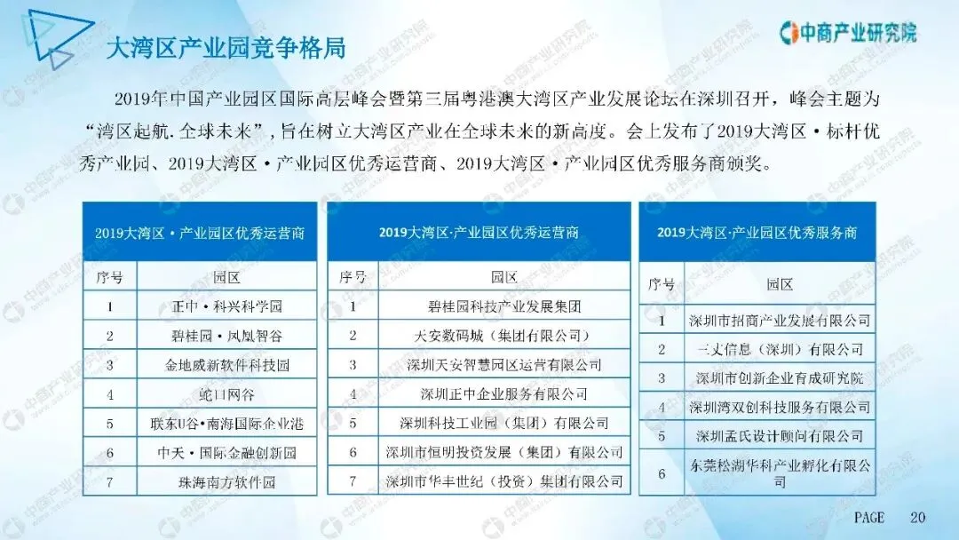 旨在树立大湾区产业在全球未来的新高度。会上发布了大湾区标杆优秀产业园、大湾区产业园区优秀运营商、大湾区产业园区优秀服务商颁奖。大湾区产业园区优秀运营商序号园区正中科兴科学园碧桂园凤凰智谷金地威新软件科技园蛇口网谷联东谷南海国际企业港中天国际金融创新园珠海南方软件园序号大湾区产业园区优秀运营商园区碧桂园科技产业发展集团天安数码城(集团有限公司)深圳天安智慧园区运营有限公司深圳正中企业服务有限公司深圳科技工业园(集团)有限公司深圳市恒明投资发展(集团)有限公司深圳市华丰世纪(投资)集团有限公司大湾区产业园区优秀服务商序号元区深圳市招商产业发展有限公司三丈信息(深圳)有限公司深圳市创新企业育成研究院深圳湾双创科技服务有限公司深圳孟氏设计顾