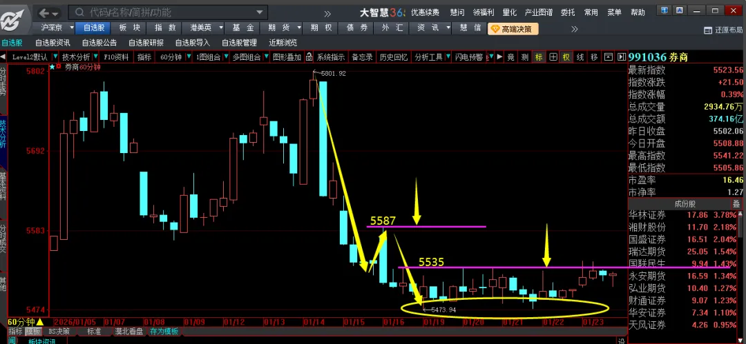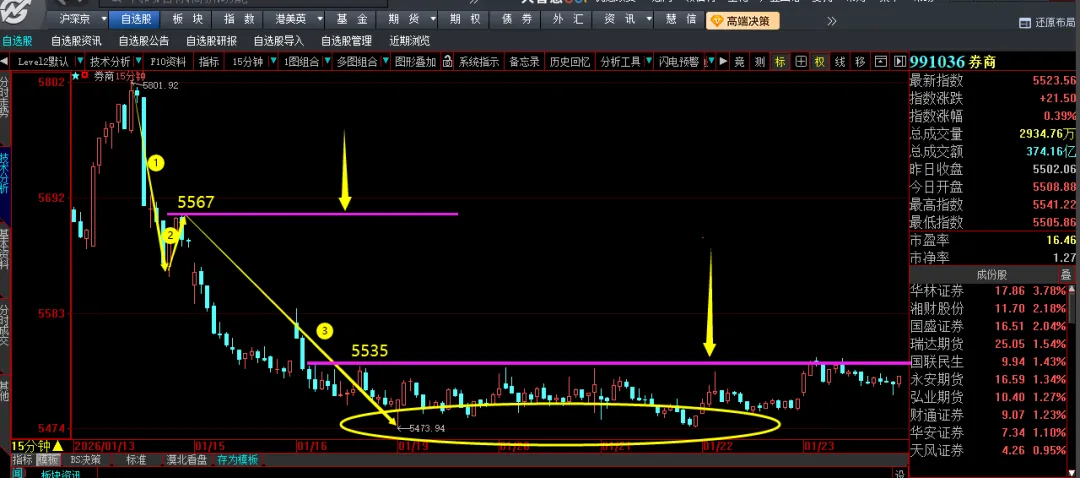 本周券商出现一个被容易忽略的“积极信号” 在上周的博文中,我们曾提醒大家-----“15、30分钟走势上。券商目前处在“3”的下行之中,理论上“3”的下探应该在见到5473后完成,也就是说券商短期处在分时“3”调整的后期,短期的压力位在5677的位置”。 本周,券商在5473的位置获得支撑、出现横盘震荡的走势。对于下周的券商走势,我们认为短期已经一个“积极信号”、先看反弹,重点是看能否顺利拿下5677这个压力位。一、分时上,注意券商完成“二次探底”后的上涨力度,见图一图二图三。1、券商自5801开始的调整在分时上不同步。 15、30分钟走势上,券商目前处在“3”的下行之中,理论上“3”的下探本周一在见到5473后就已完成、见图三,短期的压力位在5677的位置。2、60分钟走势上,券商也呈现的是“123”的下行结构,但由于“1”的下探幅度比较大、且“2”的反弹力度比较弱,其结果就会因“3”的探短期幅度过大而无法完成【备注:60分钟走势上,券商“3”的下探理论上应该5246后完成,考虑到券商在完成15、30分钟走势上“3”的下探后短期有上涨、反弹的要求,因此60分钟走势上“3”的下探这是的短期很难完成的一个目标】,60分钟走势上短期的压力位在5588的位置。3、技术上,券商在完成15、30分钟走势上“123”的下探后本身就有上涨的要求,也就是券商“4”的反弹【备注:这就是判断券商本周会有反弹的重要依据】,但遗憾的是本周一券商在见到5473、完成“3”的下探后上涨【反弹】远低于我们的预期、而采取的是横盘震荡的走势。 需要说明一点-----本周,单从券商的上涨幅度上看是不符合分时“4”的反弹要求的,这说明券商短期还有上涨、反弹的机会。4、5535是分时短期一个小的压力位。周五,券商在盘中拿下该点意味着券商分时上的“双底”成立,这对券商来说这是短期一个重要的积极因素,意味着接下来券商将会依托这个“双底”结构组织上攻、展开反弹。 需要说明一点-----本周,尽管券商表现平平【备注:上涨、反弹的幅度很小】,但完成分时上“双底”构筑这一积“极信号”是很容易被大家忽视的。5、5588以及5677是券商分时短期两个重要“压力位”。 下周开始,重点是看券商在获得支撑后的上涨能否顺利拿下5588、向上见到5677这个压力位; 技术上,拿下5677意味着券商自5801以来的调整结束得到确认、券商短期将会获得一次上攻前高的技术性的机会;相反,如果见不到5677暂时也只能先看做是券商自5801调整以来在15、30分钟走势上“4”的反弹、未来还会面临一次“5”的下探,这就是券商目前的现状。