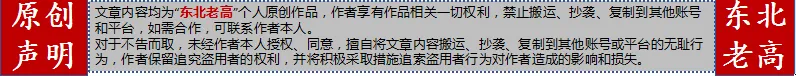 原创声明:文章内容均为“东北老高”个人原创作品,作者享有作品相关一切权利,禁止搬运、抄袭、复制到其他账号和平台,如需合作,可联系作者本人。对于不告而取,未经作者本人授权、同意,擅自将文章内容搬运、抄袭、复制到其他账号或平台的无耻行为,作者保留追究盗用者的权利,并将积极采取措施追索盗用者行为对作者造成的影响和损失。