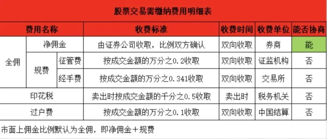 A股的交易成本=净佣金+规费+印花税+过户费,具体见下图