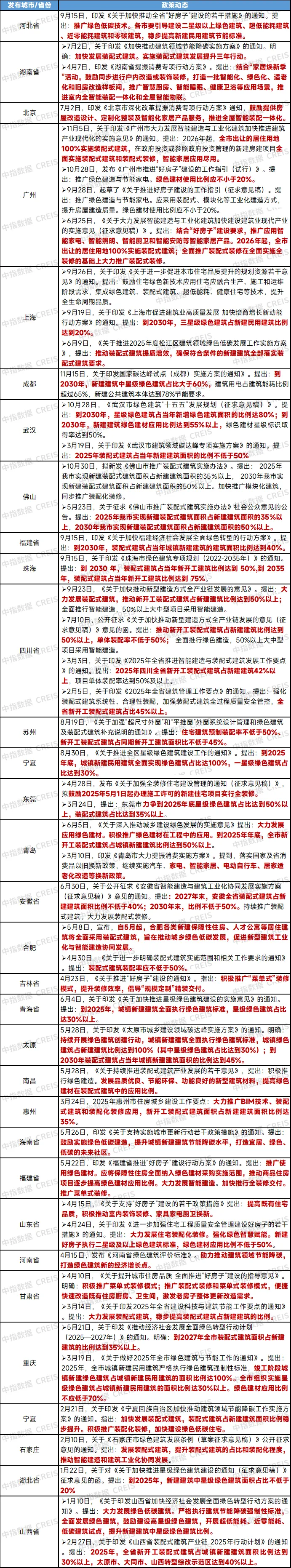 地方城市精装政策持续跟进,鼓励实施绿色低碳建造。根据中指监测统计,2025年与“碳达峰”、“绿色建筑”、“智能建造”、“绿色建材”、“装配式”、“全装修”、“以旧换新”、“好房子”等家居相关的政策法规、部发文件、征求意见、通知公告累计近200余条,其中,河北省、山东省、福建省、四川省、北京、上海、广州、重庆、青岛、成都、武汉等多省市均出台政策方案,旨在倡导大力发展智能建造和装配式建筑,推动好房子建设向智能化、数字化、品质化方向发展。鼓励实施绿色低碳建造,提升城镇新建建筑节能降碳水平,打造宜居、绿色、低碳的未来社区。