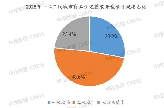 2025年,全国精装修楼盘平均精装率为27.17% ,比去年同期下降0.48个百分点。其中一线城市、二线城市、三四线城市平均精装率分别为90.9%、34.2%和11.9%,较去年同期分别下降0.9个、1.7个、0.6个百分点。